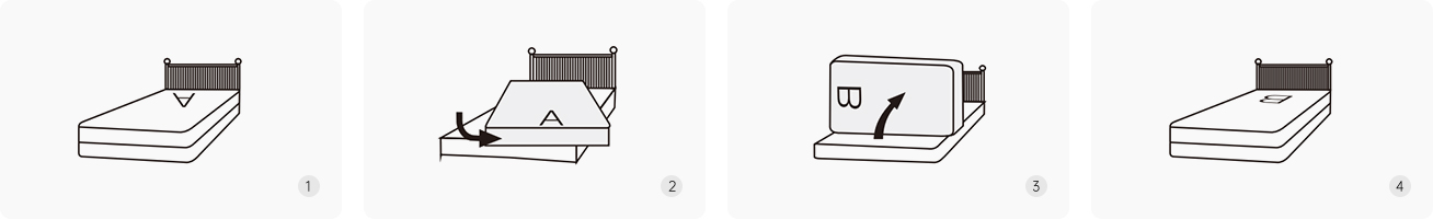 12请定期(每隔3-6个月)头尾对调或正反面互换一次来翻转床垫,可将身体压力平均分散于床垫不同部位,唤醒床垫舒缓属性,具体翻转操作如下图所示